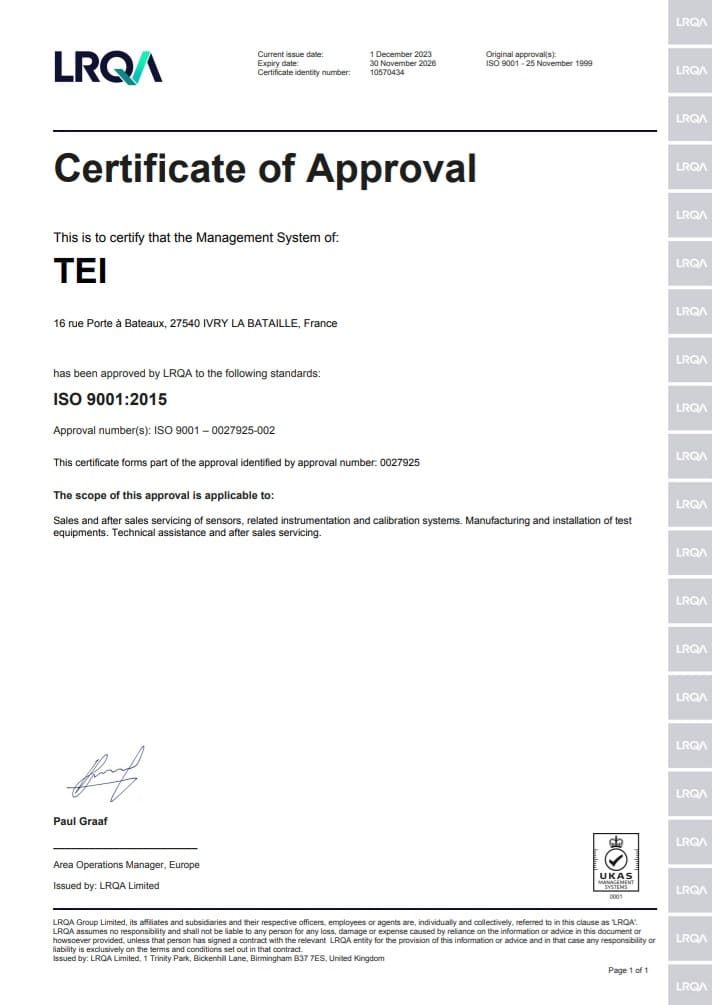Our calibration equipments are Cofrac traceable (or equivalent) and we are able to provide you with calibration certificates with new products or as part of periodic verifications.