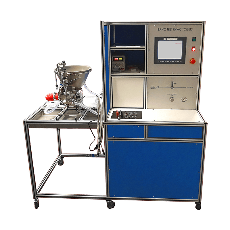 Le banc de test Toilettes Avion est destiné aux ateliers MRO souhaitant tester systèmes de toilettes avion complet ou leurs sous-ensembles (flush/rinse valves). Il intègre un système d’aspiration au vide autonome et une interface de contrôle électronique simulant la commande avionique
